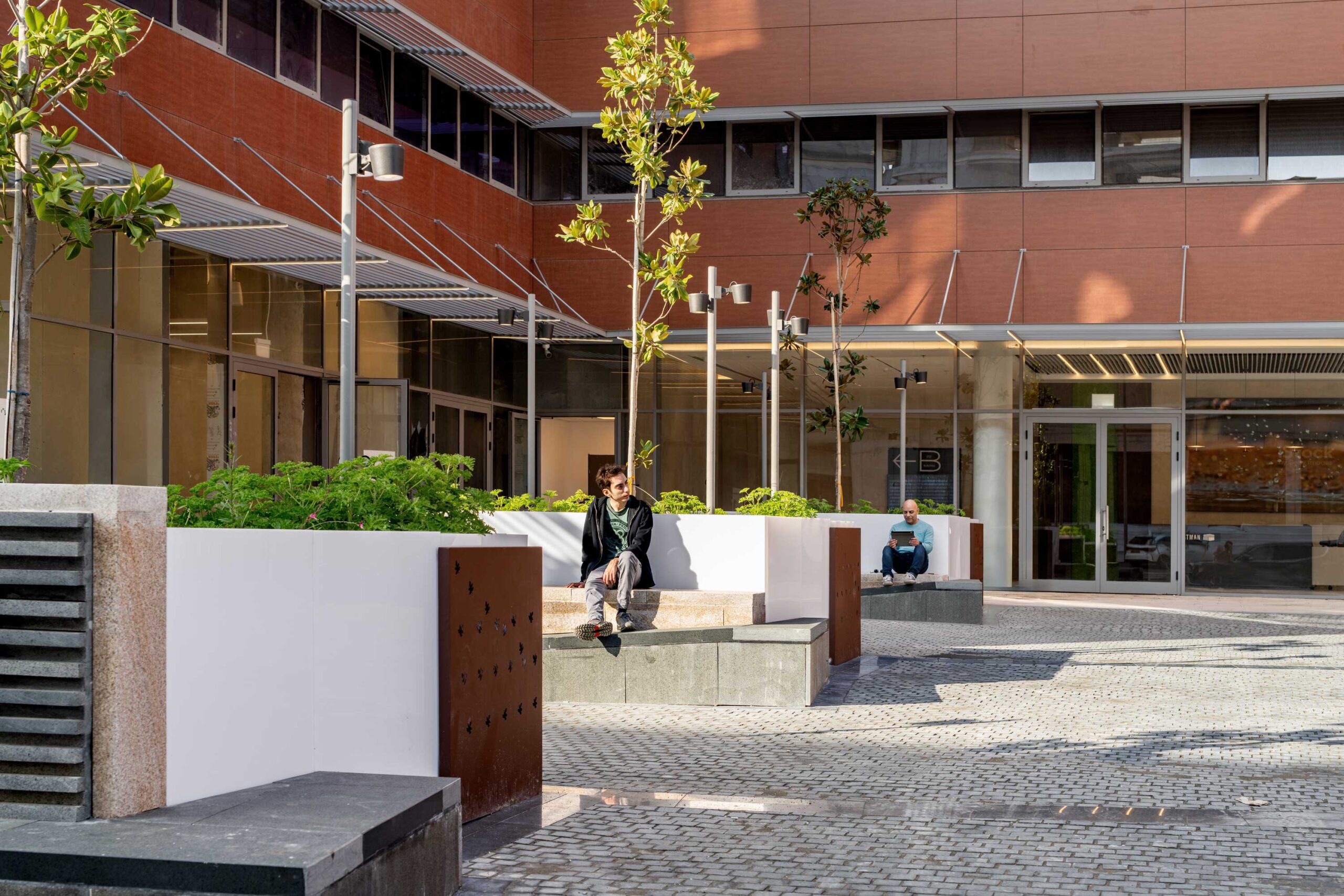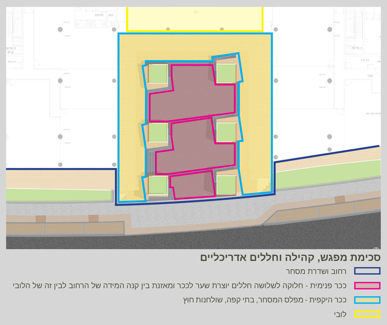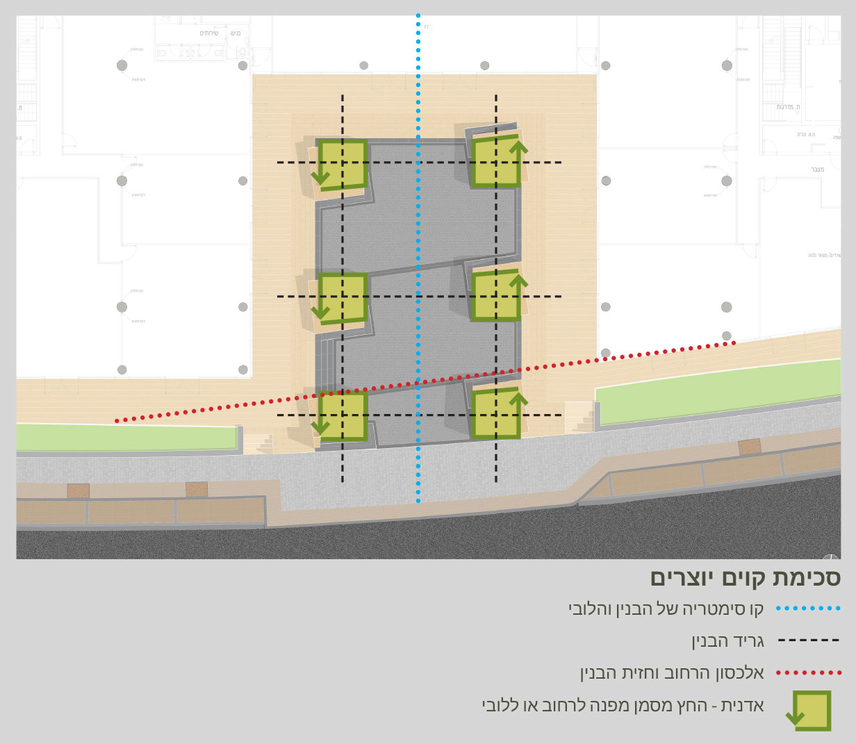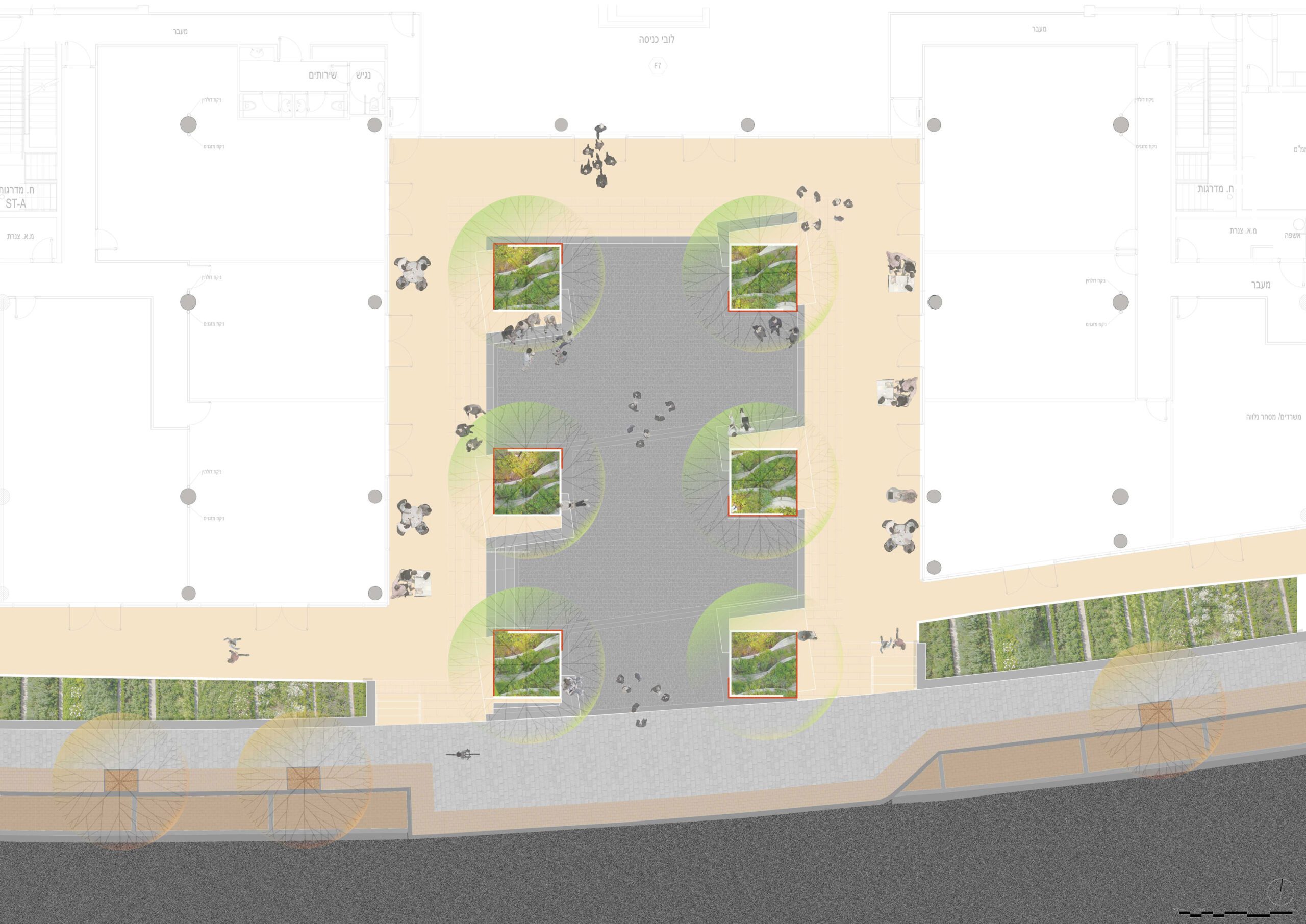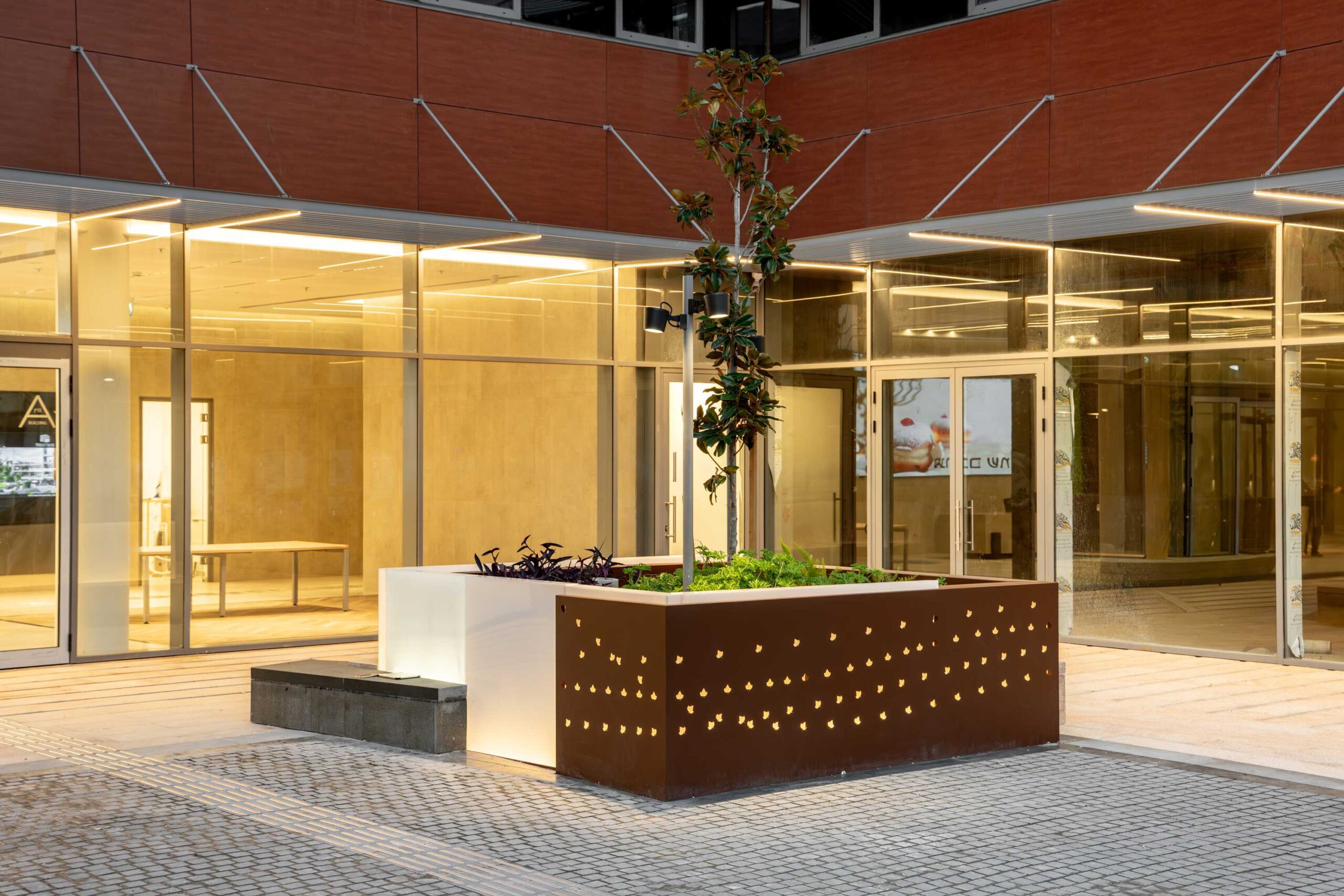 שש ערוגות בנויות עם עצי מגנוליה וצמחיה שופעת מעגנות את כיכר הכניסה הפורמלית ומארגנות את התנועה דרכה, תוך הגדרת חללי תנועה ושהייה בקני מידה שונים. הכיכר החיצונית, ברוחב 4.5 מ', במפלס החזיתות המסחריות והלובי, מתוכננת לשולחנות וישיבה בבית הקפה והמסעדה המתוכננים. הכיכר הפנימית, במידות 21X14 מ' מגשרת בשיפוע מתון על הפרש גובה של כחצי מטר בין הרחוב ללובי ומיועדת לתנועה הולכי רגל ולאירועים. בין שני חללים אלו מוצבות הערוגות ויוצרות רצף של חללי מפגש אינטימיים במידות 4X6 מ' לישיבה א-פורמלית על ספסלי אבן בגבהים שונים.
