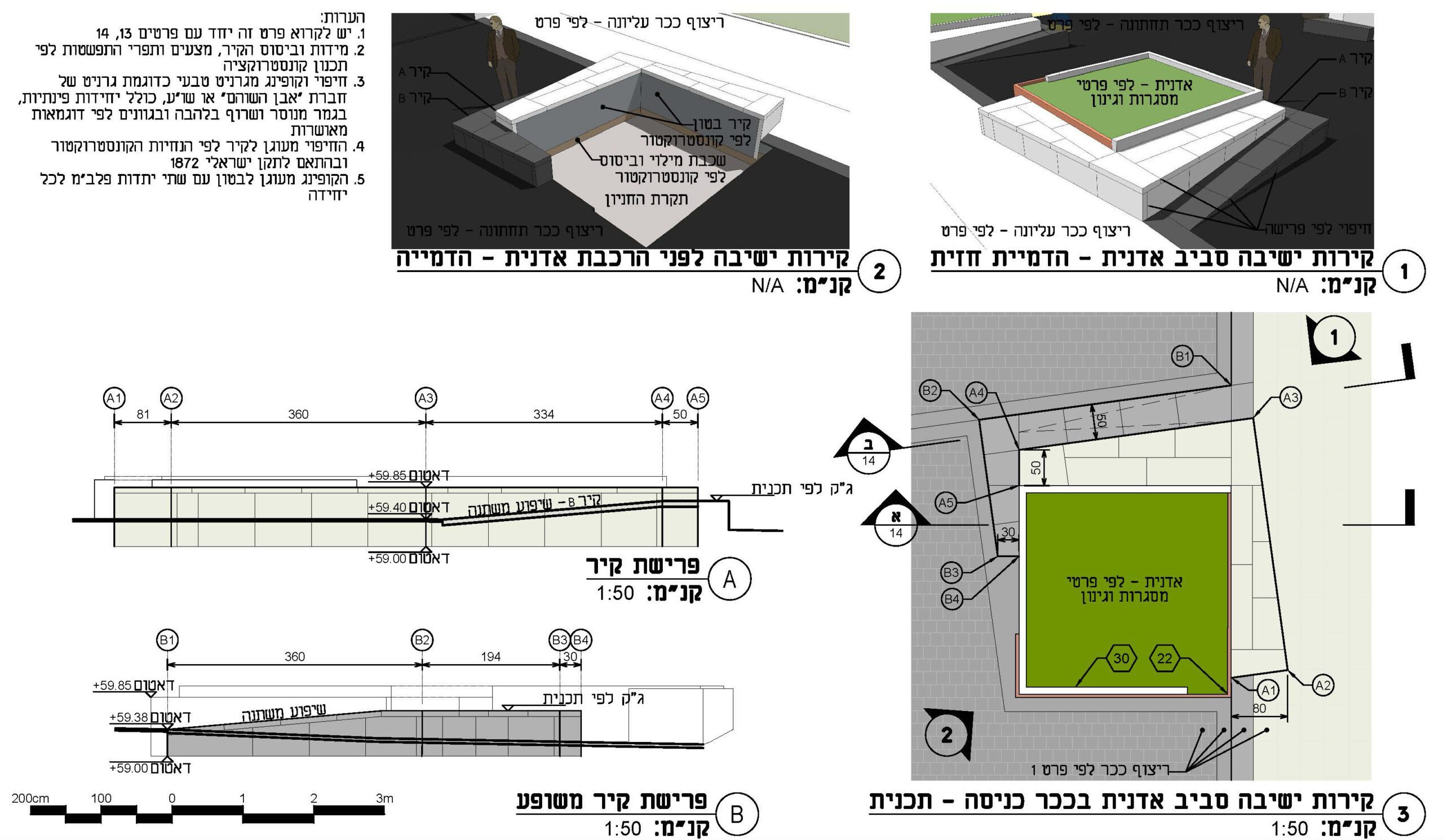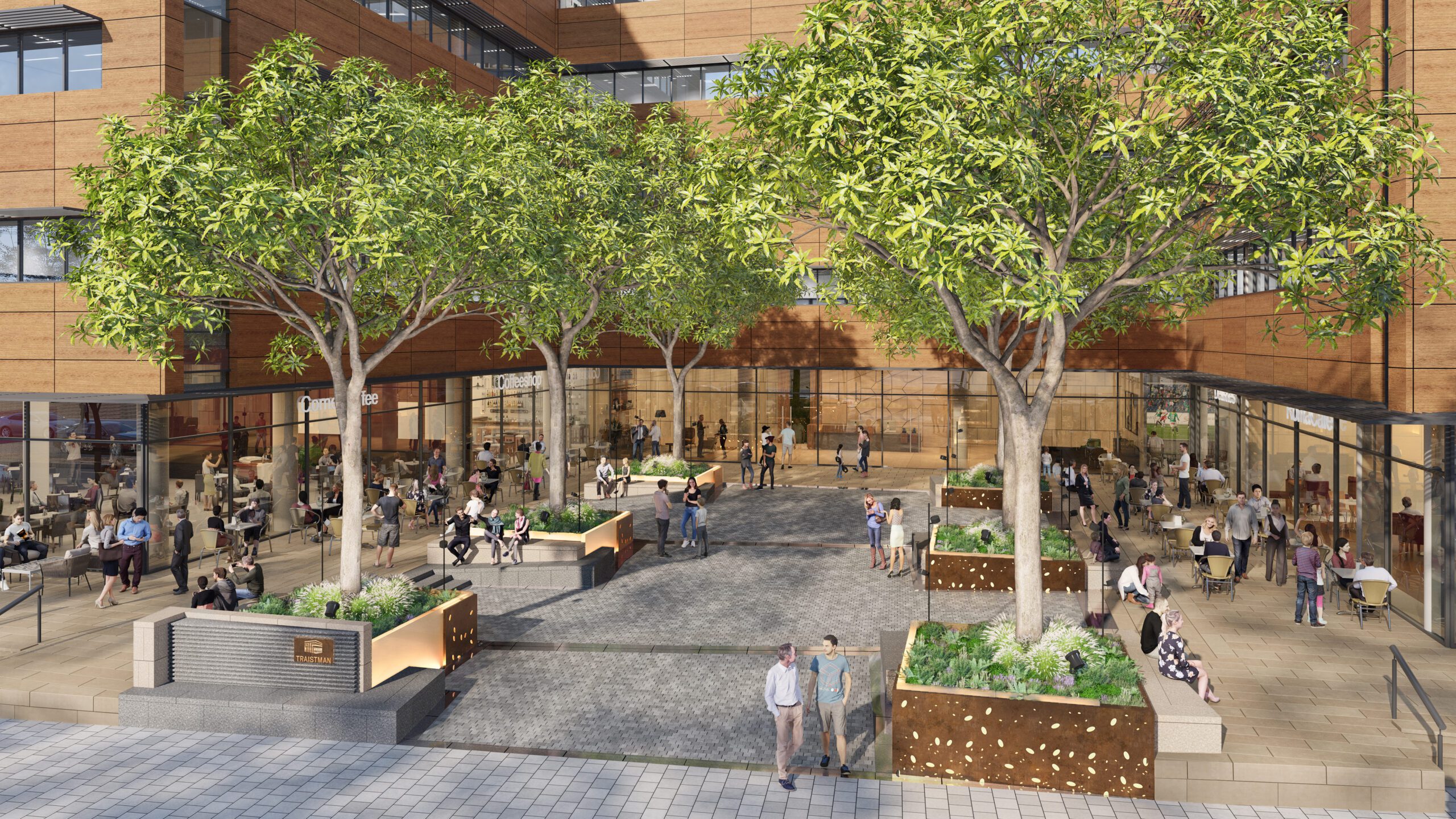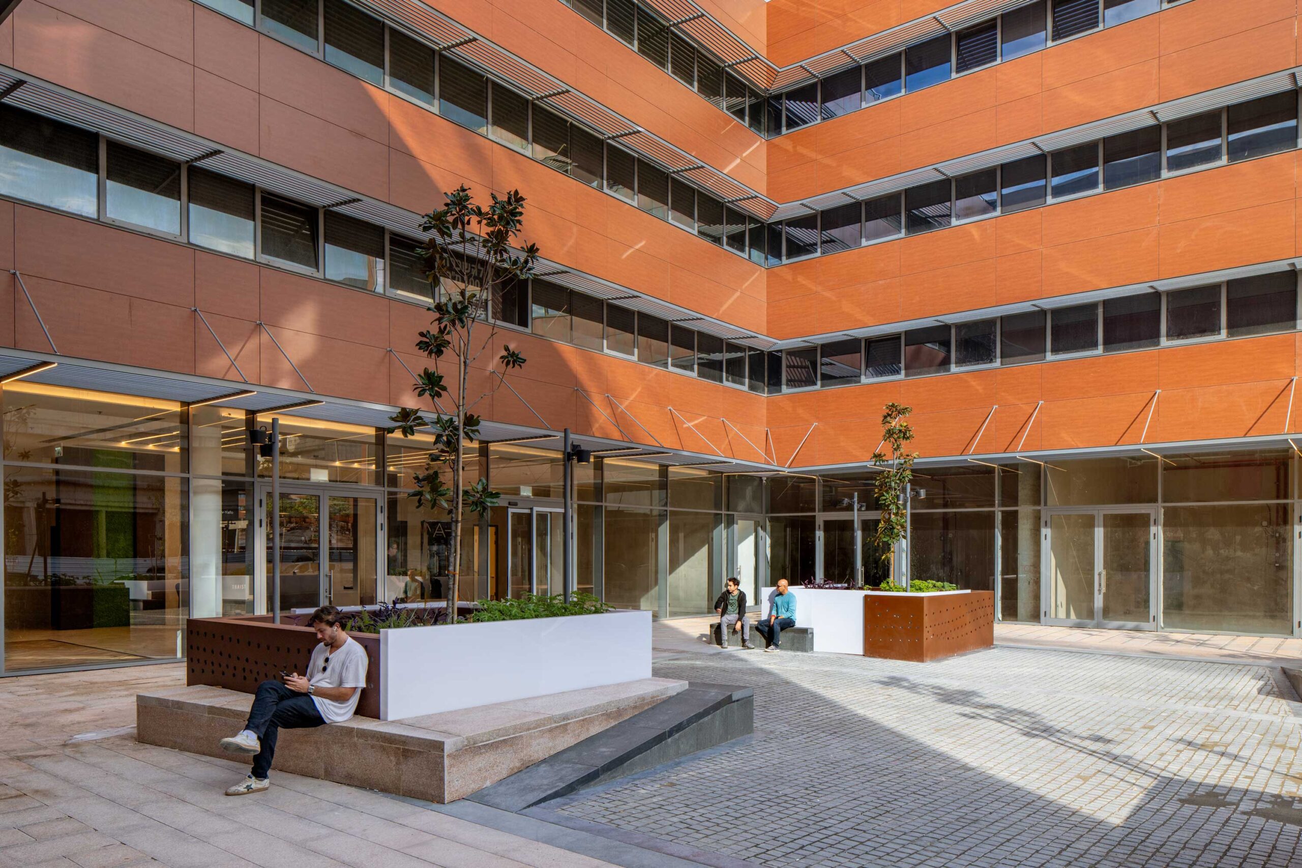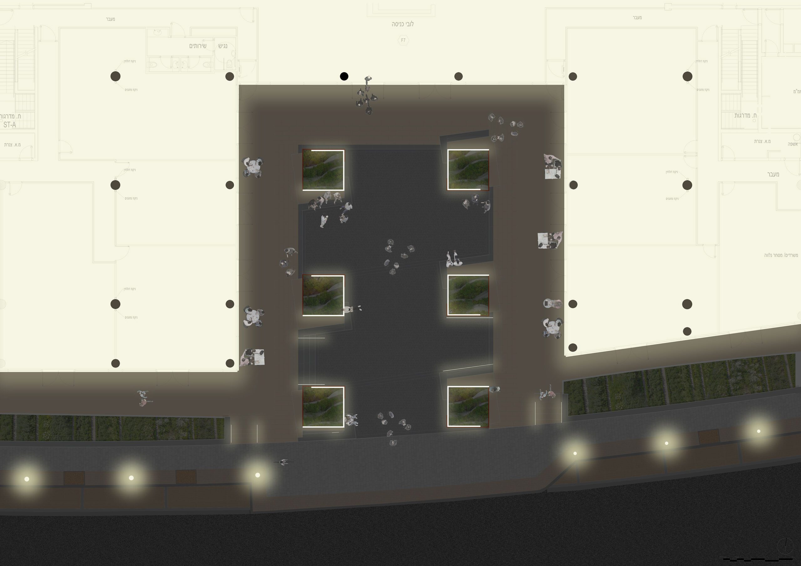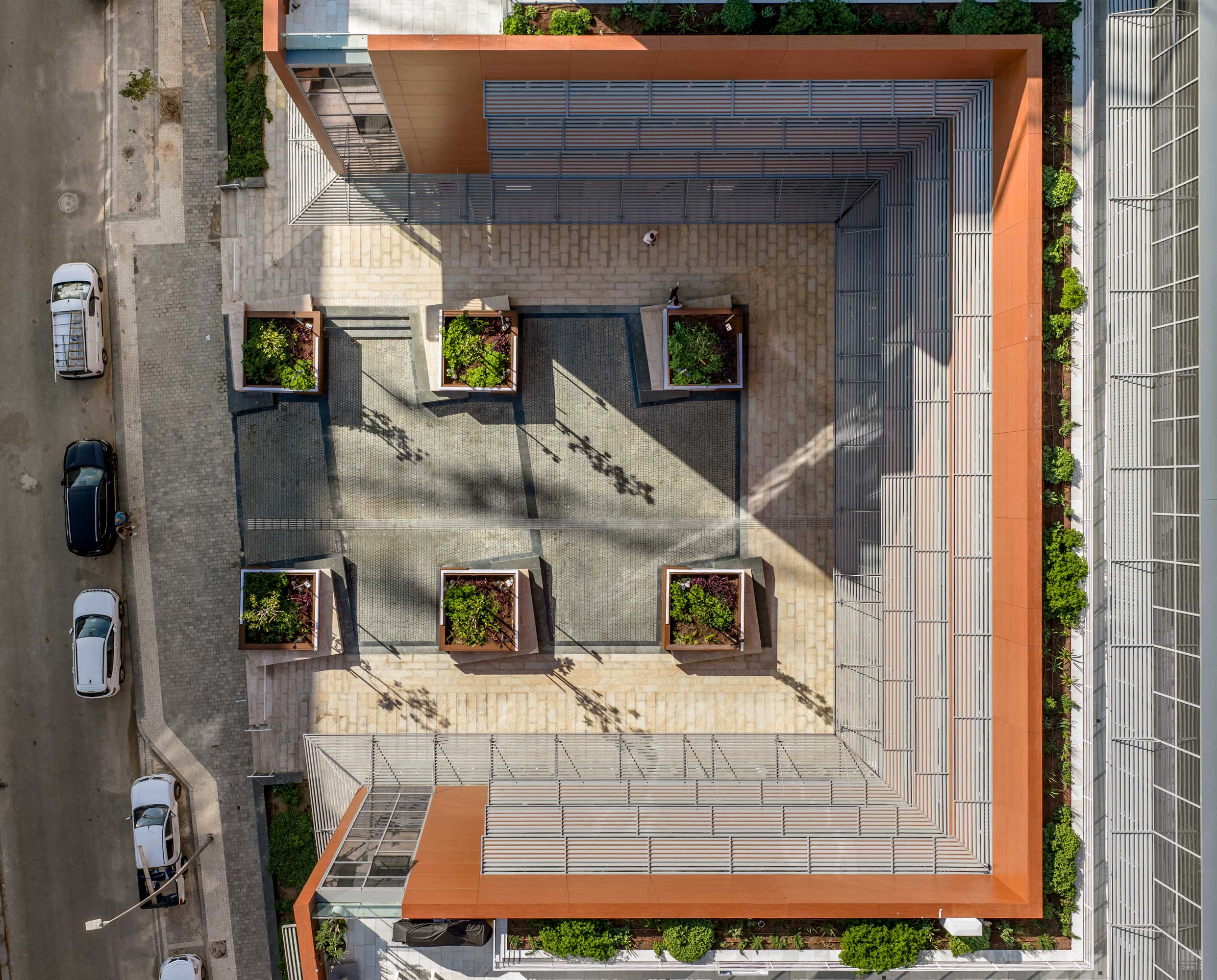 שש ערוגות בנויות עם עצי מגנוליה וצמחיה שופעת מעגנות את כיכר הכניסה הפורמלית ומארגנות את התנועה דרכה, תוך הגדרת חללי תנועה ושהייה בקני מידה שונים. הכיכר החיצונית, ברוחב 4.5 מ', במפלס החזיתות המסחריות והלובי, מתוכננת לשולחנות וישיבה בבית הקפה והמסעדה המתוכננים. הכיכר הפנימית, במידות 21X14 מ' מגשרת בשיפוע מתון על הפרש גובה של כחצי מטר בין הרחוב ללובי ומיועדת לתנועה הולכי רגל ולאירועים. בין שני חללים אלו מוצבות הערוגות ויוצרות רצף של חללי מפגש אינטימיים במידות 4X6 מ' לישיבה א-פורמלית על ספסלי אבן בגבהים שונים.