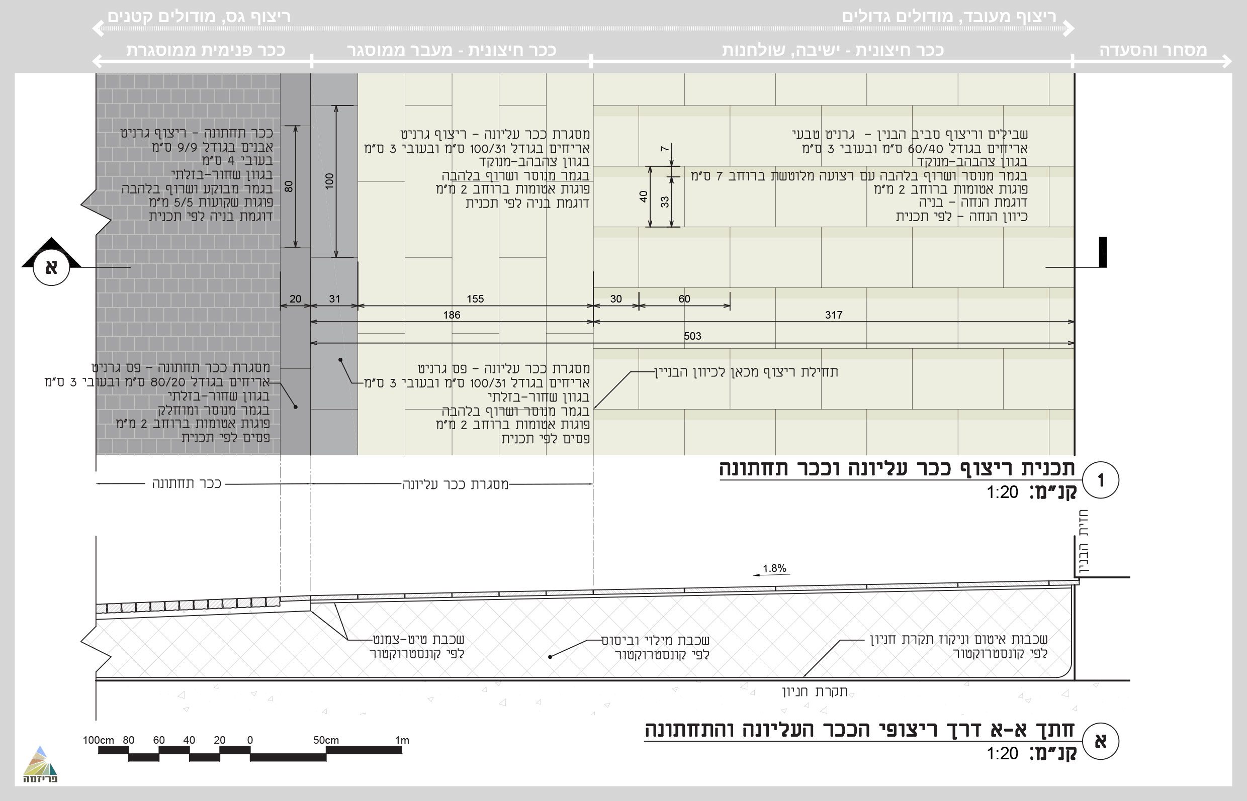 חומר הפיתוח העיקרי הוא גרניט בשני גוונים, עם מגוון עשיר של גדלים וגימורים – גסים יותר במרכז ומהוקצעים בהיקף. חיפוי הקורטן של האדניות תואם לגוון חיפוי ה HPL של חזית הבנין ולגוון הריצוף הבהיר. השכבה הפנימית ביותר בספירלה המקיפה כל אדנית מורכבת מתיבות מודולריות המוארות מבפנים ומעניקות תאורה דקורטיבית, רכה ונעימה.